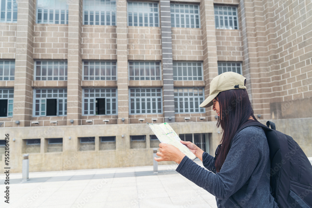 Asian young woman traveler backpack looking maps brochure at museum. Female travel passenger by plane tourist baggage. Happy Tourism trip women journey on vacation. Relax women walking in old town.