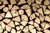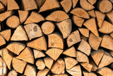 Split hardwood firewood stacked in a row to dry. Dry firewoods texture