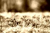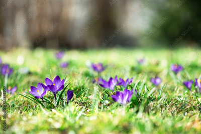 Meadow of of purple crocus flowers in spring forest. Nature photography