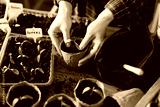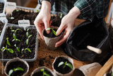 Farmer transplants hot pepper seedlings into peat cups. Preparing plants for growing in open ground. Home gardening concept