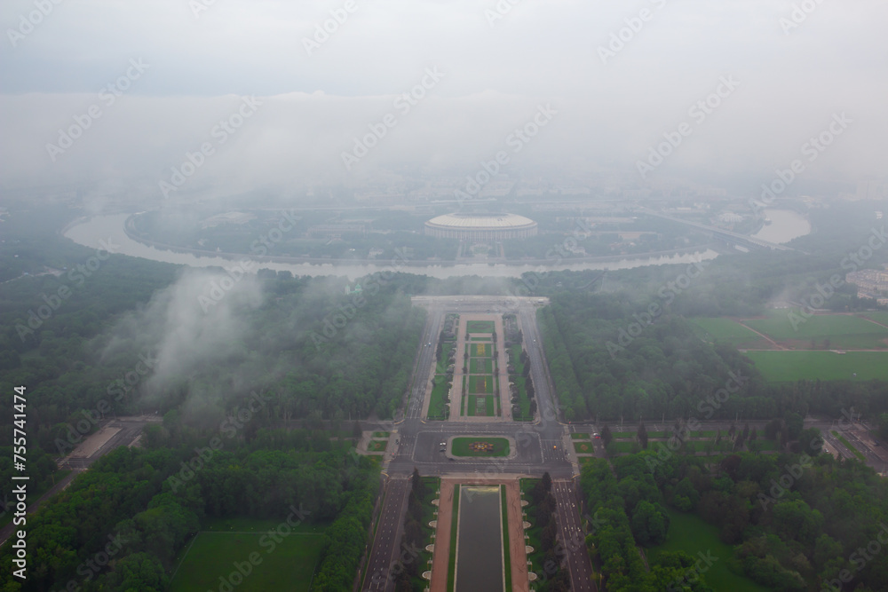 Luzhniki sport complex in foggy early morning in Moscow, Russia, view from MSU
