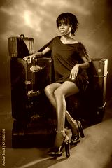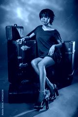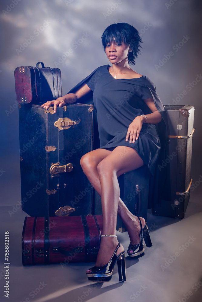 Woman sits among old suitcases. African American girl. Woman in short dress with high heels. Beautiful woman in gray studio. Lady posing near travel suitcases. Ethnic girl in dark studio