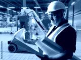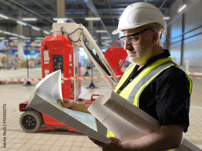 Man builder. Architect supermarket building. Builder holding architectural drawings. Preparing for construction of grocery store. Builder man in building future supermarket. Engineer in yellow vest