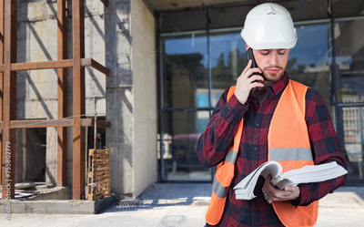 Man builder makes phone call. Guy is employee of architectural bureau. Builder stands near unfinished building. Construction contractor. Man engineer holds stack of documents. Builder calls customer.