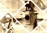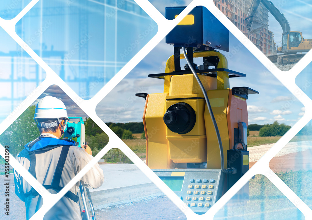 Geodesy in road construction. Equipment for geodetic work. Construction worker with optical theodolite. Apparatus for building geodesy. Geodetic technologies. Surveyor guy with his back to camera