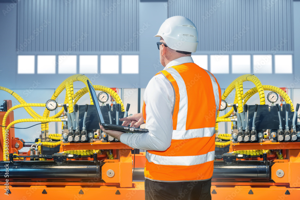 Man industrialist. Factory worker with laptop. Specialist sets up industrial equipment. Man works in automated factory. Robotic manufactory inside hangar. Industrial equipment programming