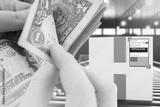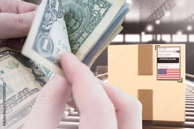 Import of goods from USA. Money near cardboard box. Dollars to pay for import. Hands of person ordering goods in USA. Parcel from United States of America. Deal with American industrial company.