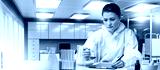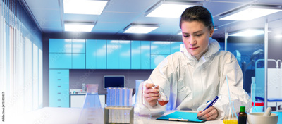 Woman doctor develops new medicines. Medical girl holds test tube. Scientist at laboratory table. Woman doctor writes down result of experiment. Hospital laboratory technician. Doctor at work