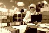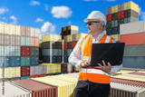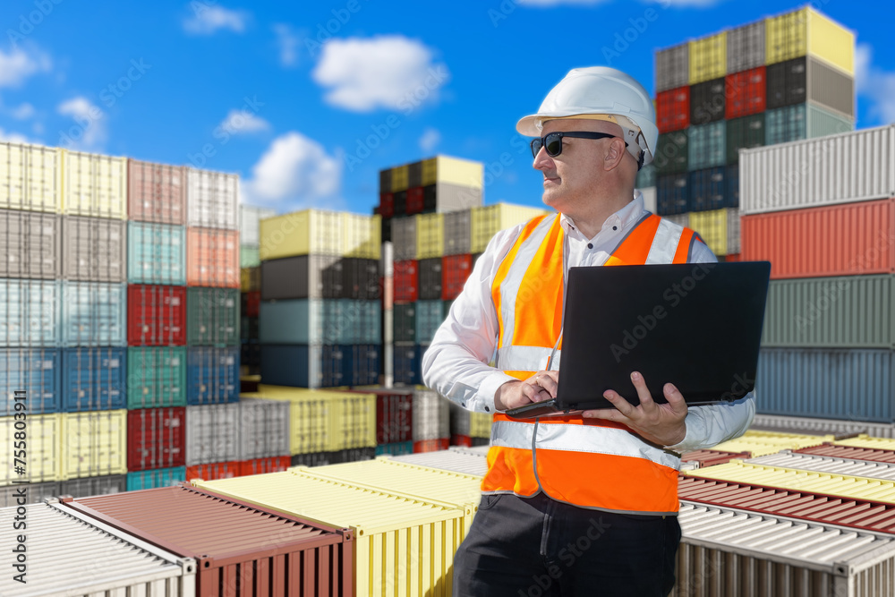 Man stands near container site. Logistician at seaport with laptop in hands. Stacks of multi-colored cargo containers. Guy is cargo harbor dispatcher. Logistician inspects large container yard
