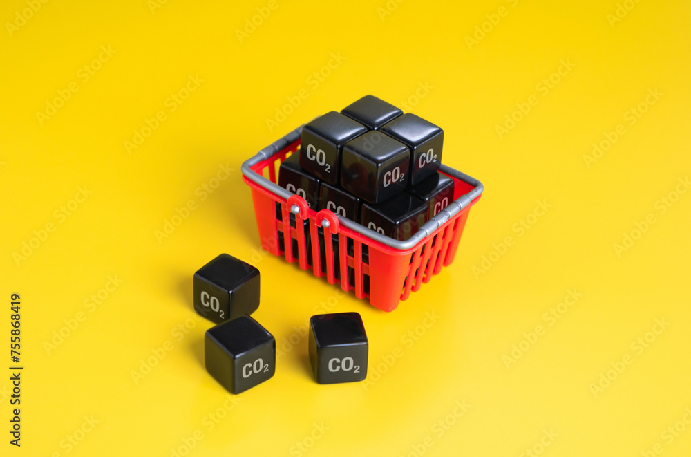 Shopping basket and cubic CO2 greenhouse gas. Calculate the customers carbon footprint. Reduce environmental impact. Reconsider diet and brands to be more environmentally friendly and recycling.