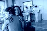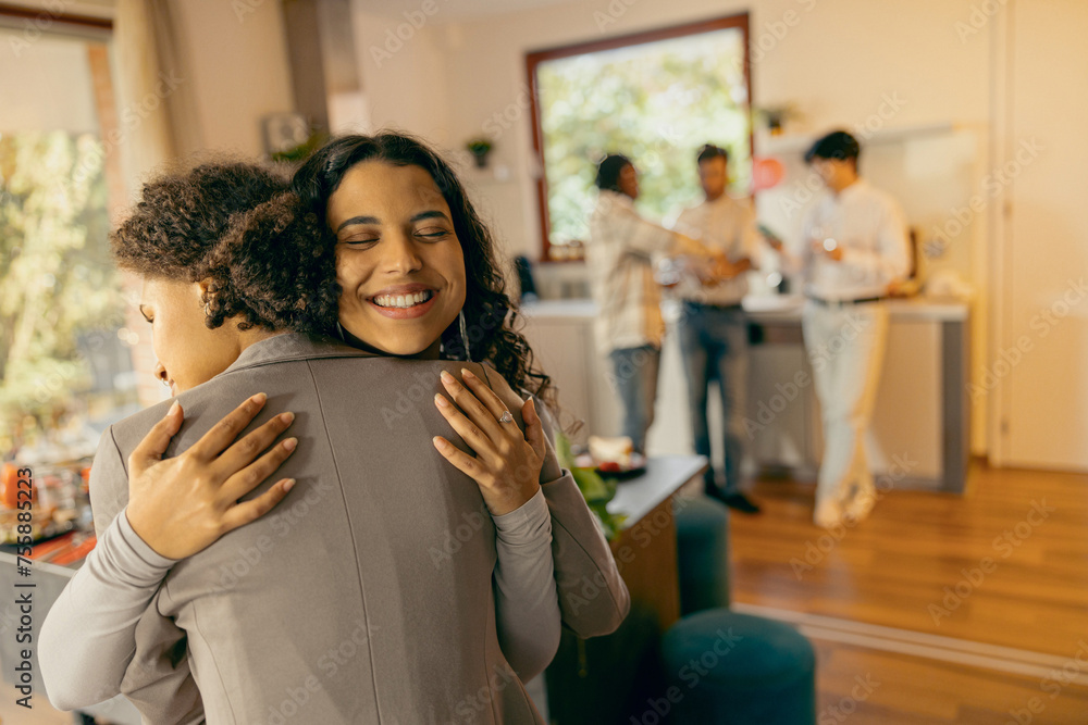 Smiling female friends hugging and enjoy time spent together on holiday home party