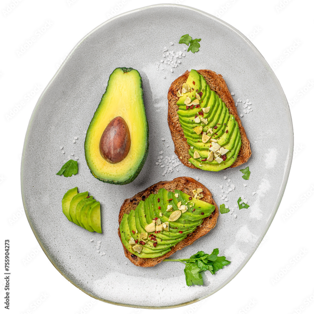 avocado toasts rye bread, sliced avocado, pumpkin seeds isolated on white background. clipping path included
