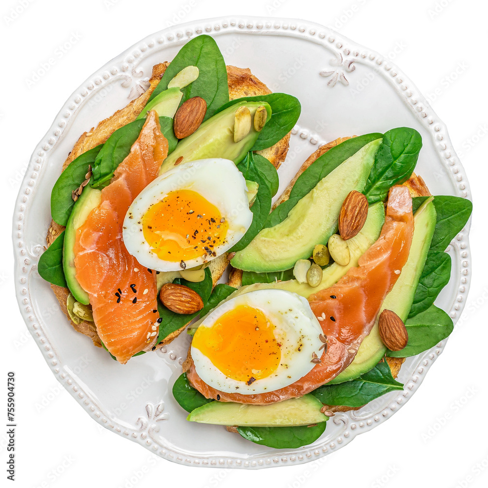 toasts with avocado, salmon and spinach, nuts, sunflower seeds isolated on white background. clipping path included