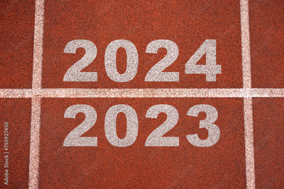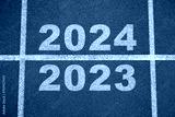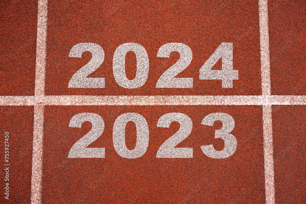 Happy new year 2024 symbolizes the start of the new year. Rear view of a man preparing to run on the athletics track engraved with the year 2024. The goal of Success. Getting ready for the new year.