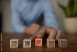 Hand arranging wood block stacking with business strategy and Action plan, targeting the business concept. Business development concept.