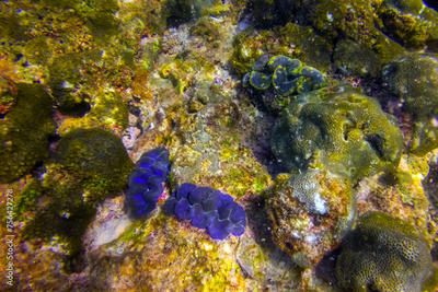 Many blue, turquoise and brown colorful tridacna clams and sea urchins on the coral reef underwater tropical exotic world.