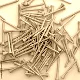A pile of natural wood colour 70mm bamboo golf tees lying on a white surface