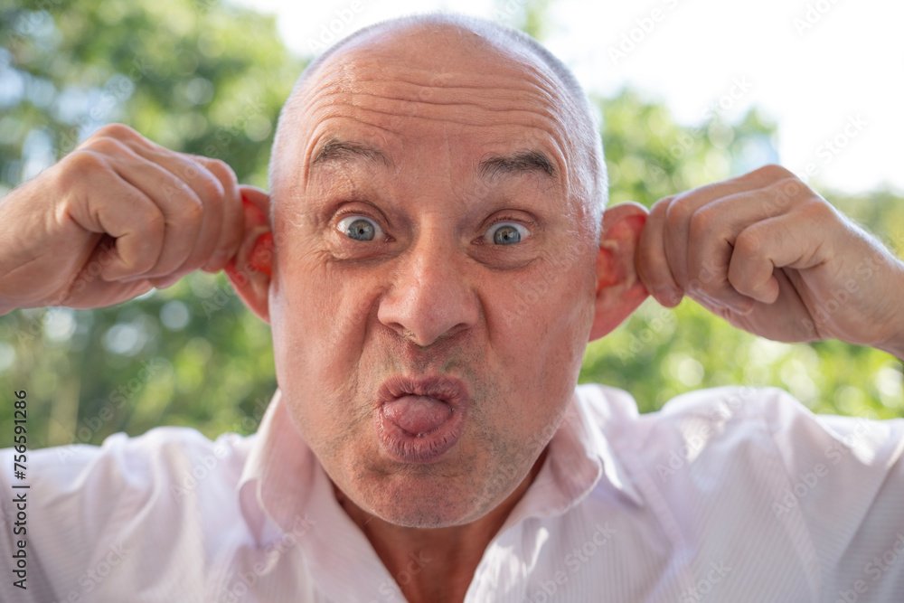 happy senior joking around, making funny faces, caucasian man 60-65 years old smiling, close-up face, good mood, mental human health, Emotional Freedom and Expression of Feelings, Joy in Everyday Life