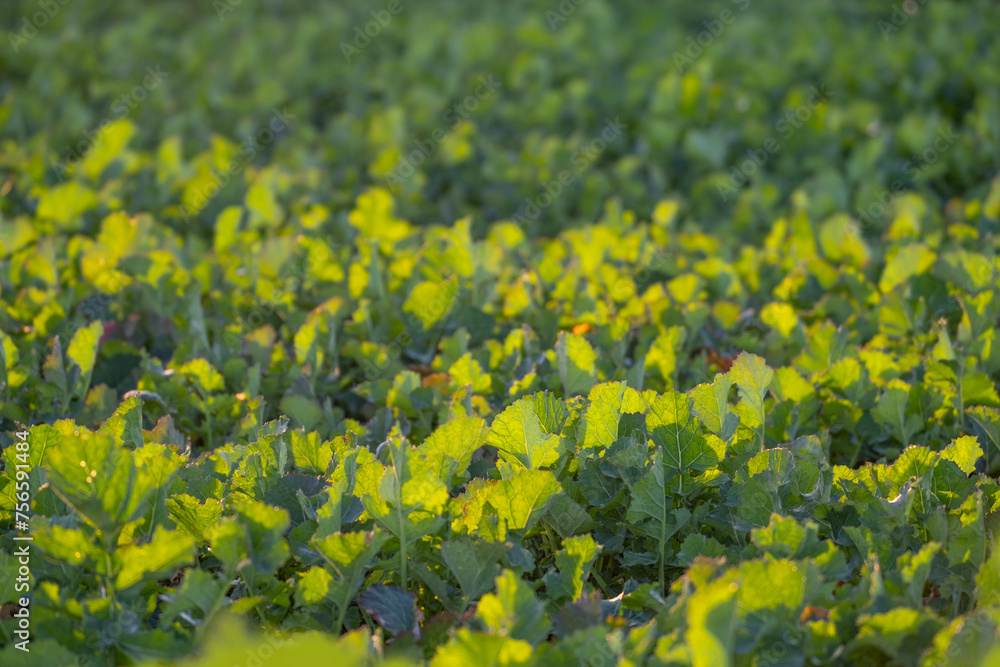 beautiful spring landscape, young rapeseed plants in sun, green fields of ripening agro culture, agricultural concept, growing crop, environmentally friendly plants, vegetable oil production