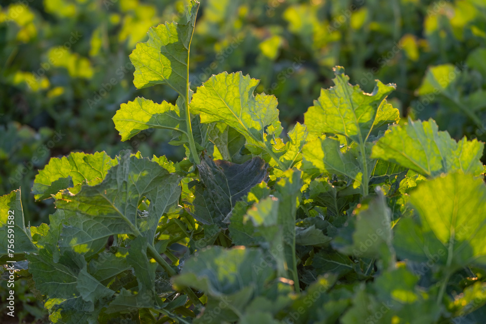 beautiful spring landscape, young rapeseed plants in sun, green fields of ripening agro culture, agricultural concept, growing crop, environmentally friendly plants, vegetable oil production