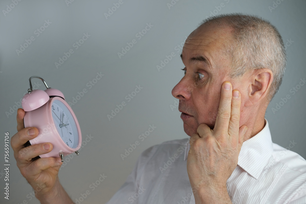 close-up mature man, senior 60 years old holds alarm clock in hand, concept missing time, oversleeping important meeting, life deadline, active SeniorLife, old age crisis, decrease in overall activity