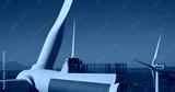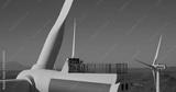 Large wind turbine rotating blades . Engineer performing repairing and maintenance works on top of wind turbine nacelle house.