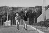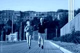 Active senior pair enjoy running, sporty physically energetic older man and woman outdoor jogging. Elderly people on street physical exercise, open air activity to boost mood, energy levels, memory
