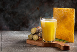Glass of sugarcane juice with fried pastry. Typical Brazilian snack.