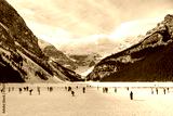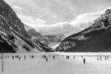 Visitors skating on frozen Lake Louise in Winter against the backdrop of the stunning Victoria Glacier