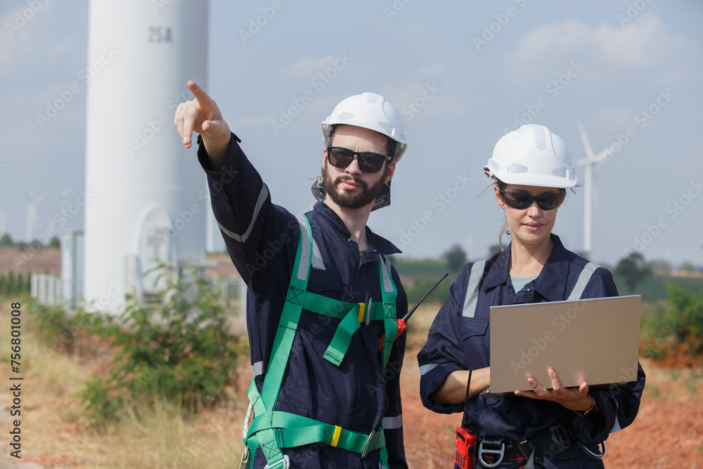 Team engineer wearing safety uniform holding laptop discussed plan about renewable energy at station energy power wind. technology protect environment reduce global warming problems.