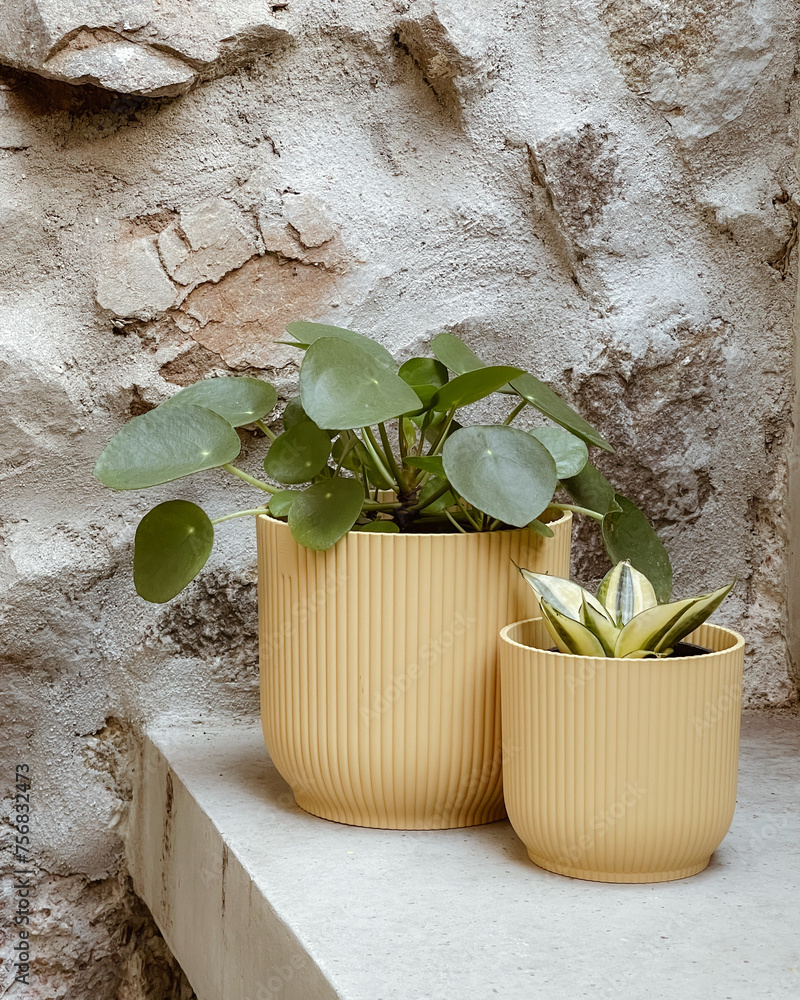 Planta Sansevieria en maceta antigua descansando sobre mantel bordado vintage