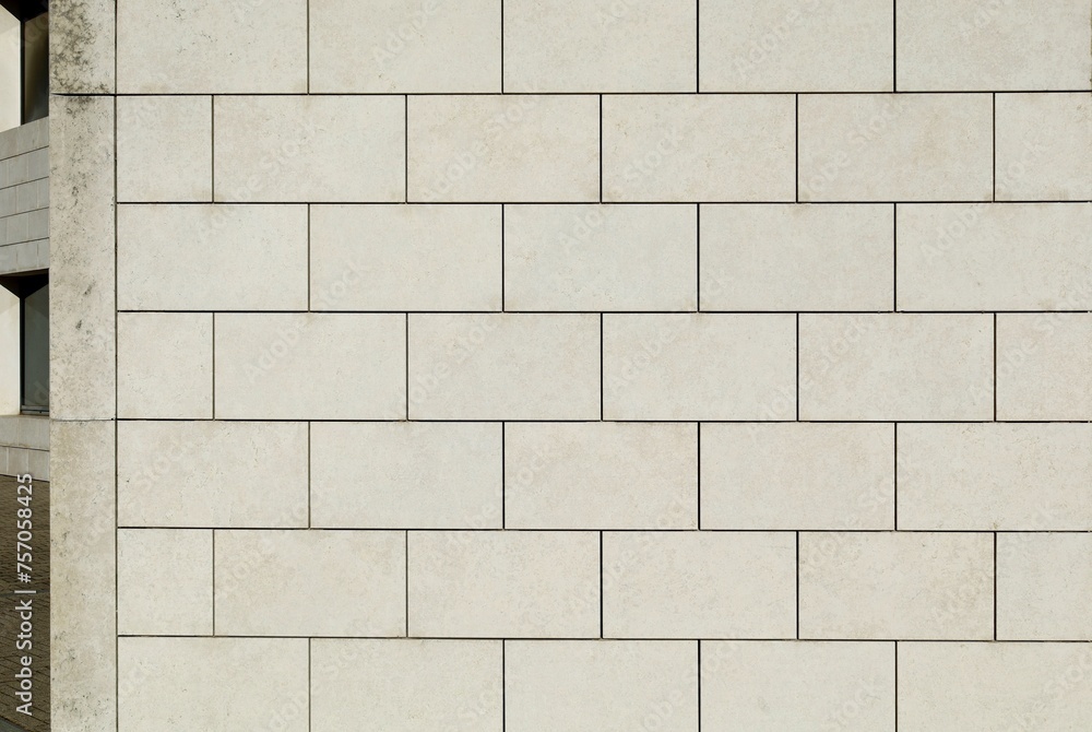 Classic light gray rectangle granite tiles of an outdoor facade wall. Background and texture.
