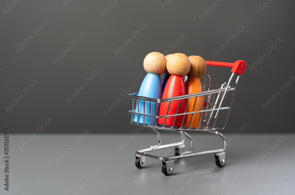 People in a shopping cart. Marketing, consumerism. Human trafficking. Products and marketing strategies. Buyer preferences. Customers