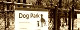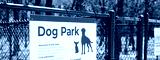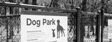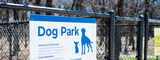 Panorama dog park sign with rules policies on galvanized vinyl-coated chain link fences, steel posts panels at rest area public picnic location along highway in Oklahoma, security fencing gate