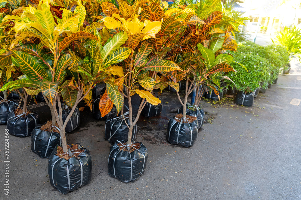 Variety of beautiful croton ornamental plants were on sale at the garden market.