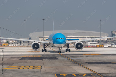 Front view Commercial airplane parking, ready to taxiing there is staircase boarding passengers. Modern, new generation jet powered passenger aircraft is waiting airport