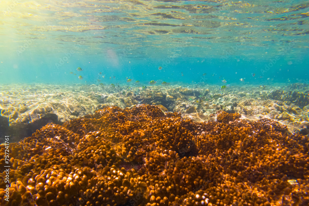 Various tropical fish abudefduf feed in the warm unser water of the ocean among corals. School of parrot fish spawning and feeding shallow water, shoal, biocenosis reef of attol