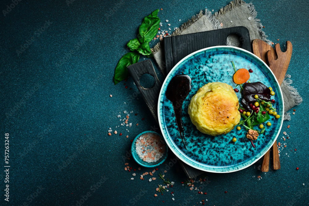 Azerbaijani cabbage dish. Stewed cabbage. Free space for text. On a dark background.