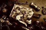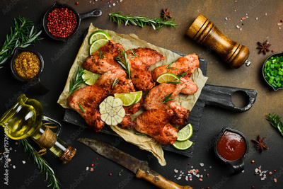 Baked Buffalo chicken wings with onions and spices on a board. On a dark background.