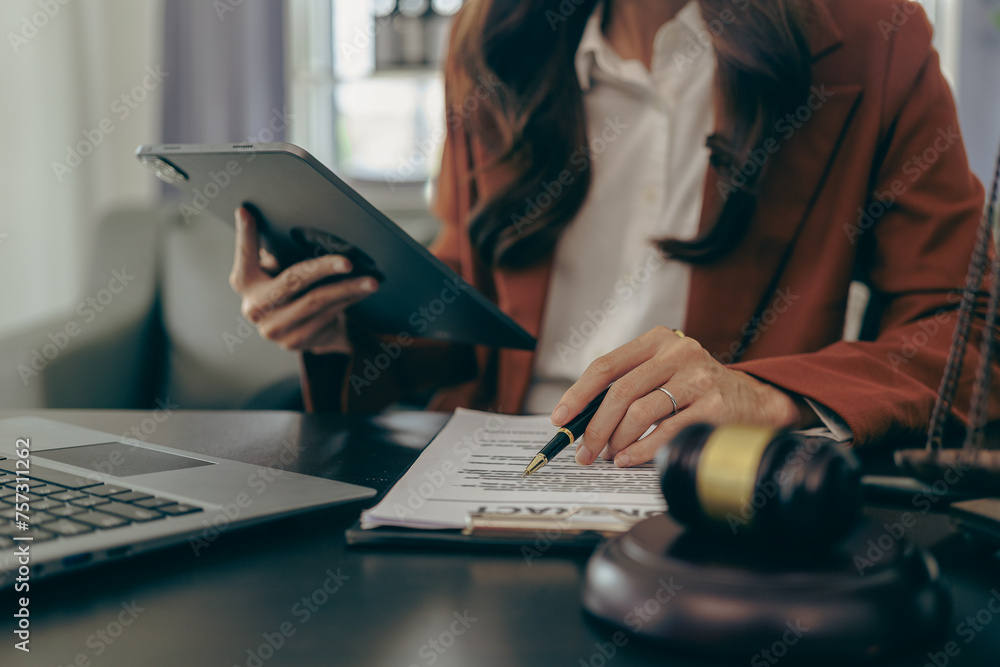Female lawyer working in office or court with hammer and scale, justice on table, online legal advice, lawyer, consultant, justice and law, lawyer concept, close-up image