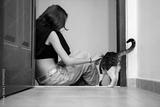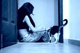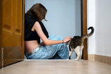 A girl plays with a street cat.