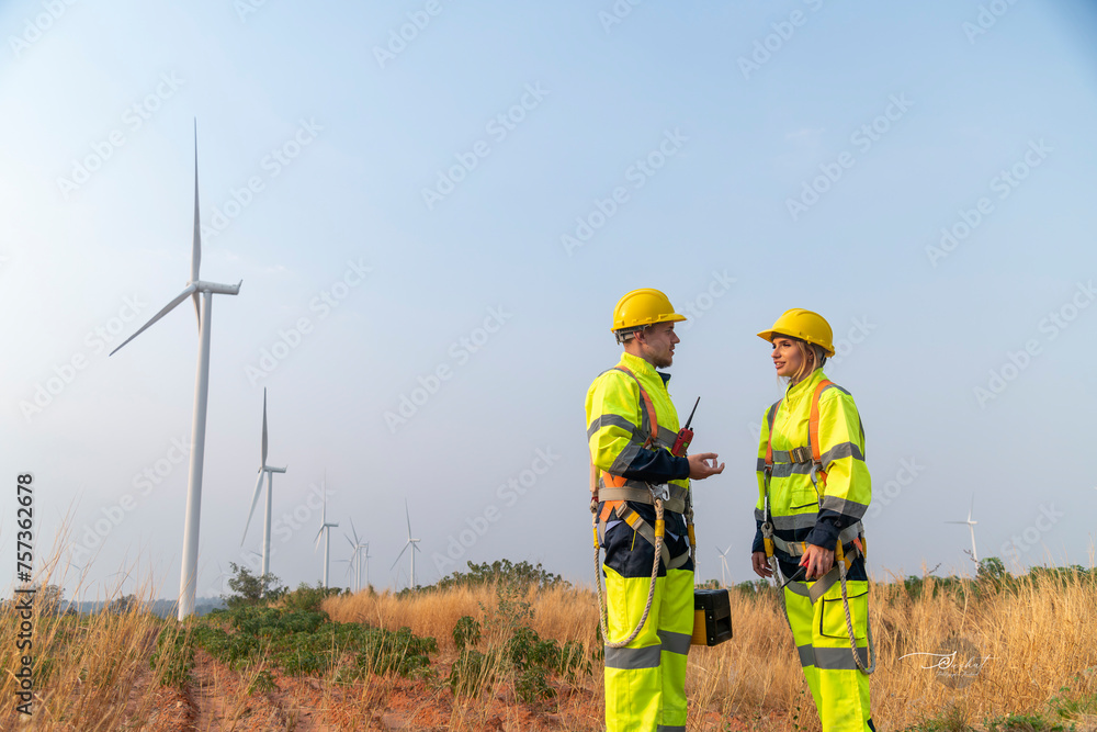 Engineer surveyor and manager wearing uniform walking holding box inspection and tablet work in wind turbine farms rotation to electricity, alternative renewable energy for clean power energy concept.