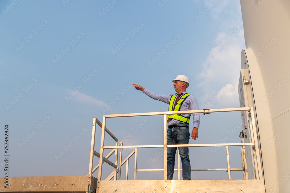 Engineer manager wearing uniform inspection work in wind turbine farms rotation to generate electricity energy. Green ecological power energy generation wind sustainable energy concept.
