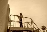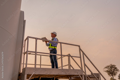 Engineer manager wearing uniform inspection work in wind turbine farms rotation to generate electricity energy. Green ecological power energy generation wind sustainable energy concept.