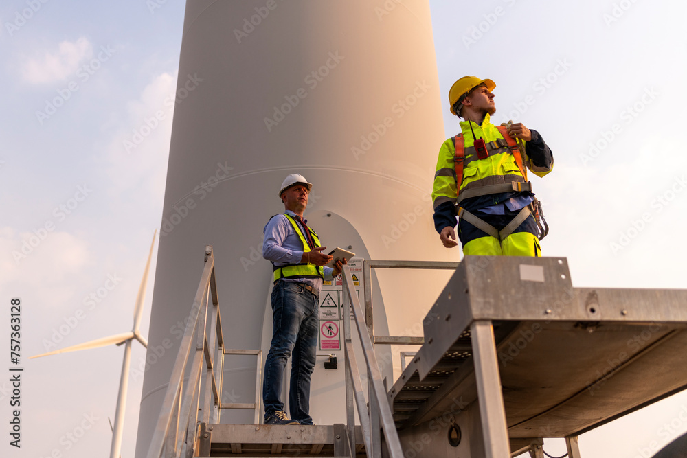 Engineer surveyor and manager wearing uniform walking holding box inspection and tablet work in wind turbine farms rotation to electricity, alternative renewable energy for clean power energy concept.