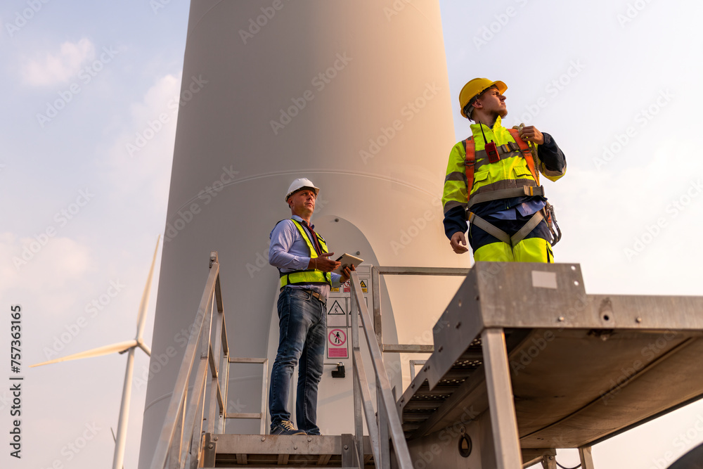 Engineer surveyor and manager wearing uniform walking holding box inspection and tablet work in wind turbine farms rotation to electricity, alternative renewable energy for clean power energy concept.