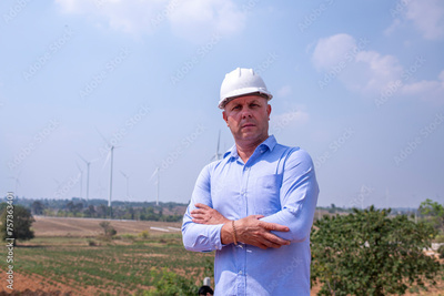 Engineer surveyor and manager wearing uniform walking holding box inspection and tablet work in wind turbine farms rotation to electricity, alternative renewable energy for clean power energy concept.