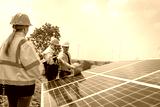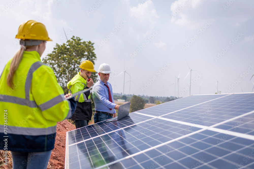 Engineers working inspect and check solar cell panel energy is smart grid ecology energy sunlight alternative power with wind turbine farms rotation to generate electricity.