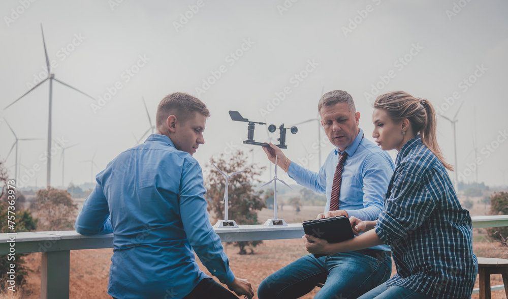 Engineers turbine windmill work in turbine farms rotation resource from windmill turbine model and meteorological collect data to measure the wind force meter is ecology energy concept.