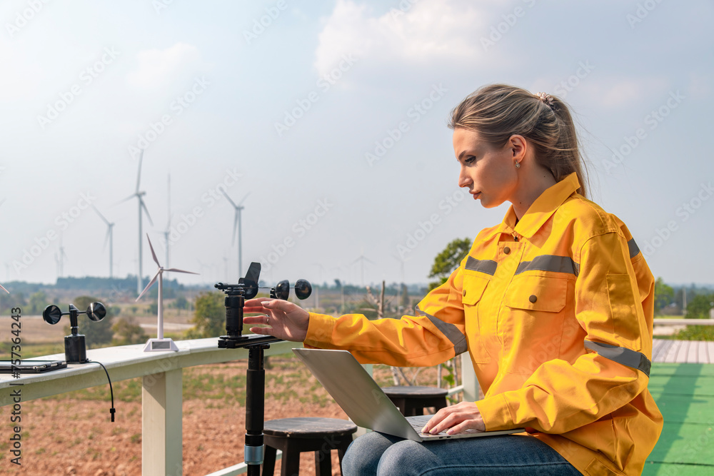 Engineers turbine windmill work in turbine farms rotation resource from windmill turbine model and meteorological collect data to measure the wind force meter is ecology energy concept.